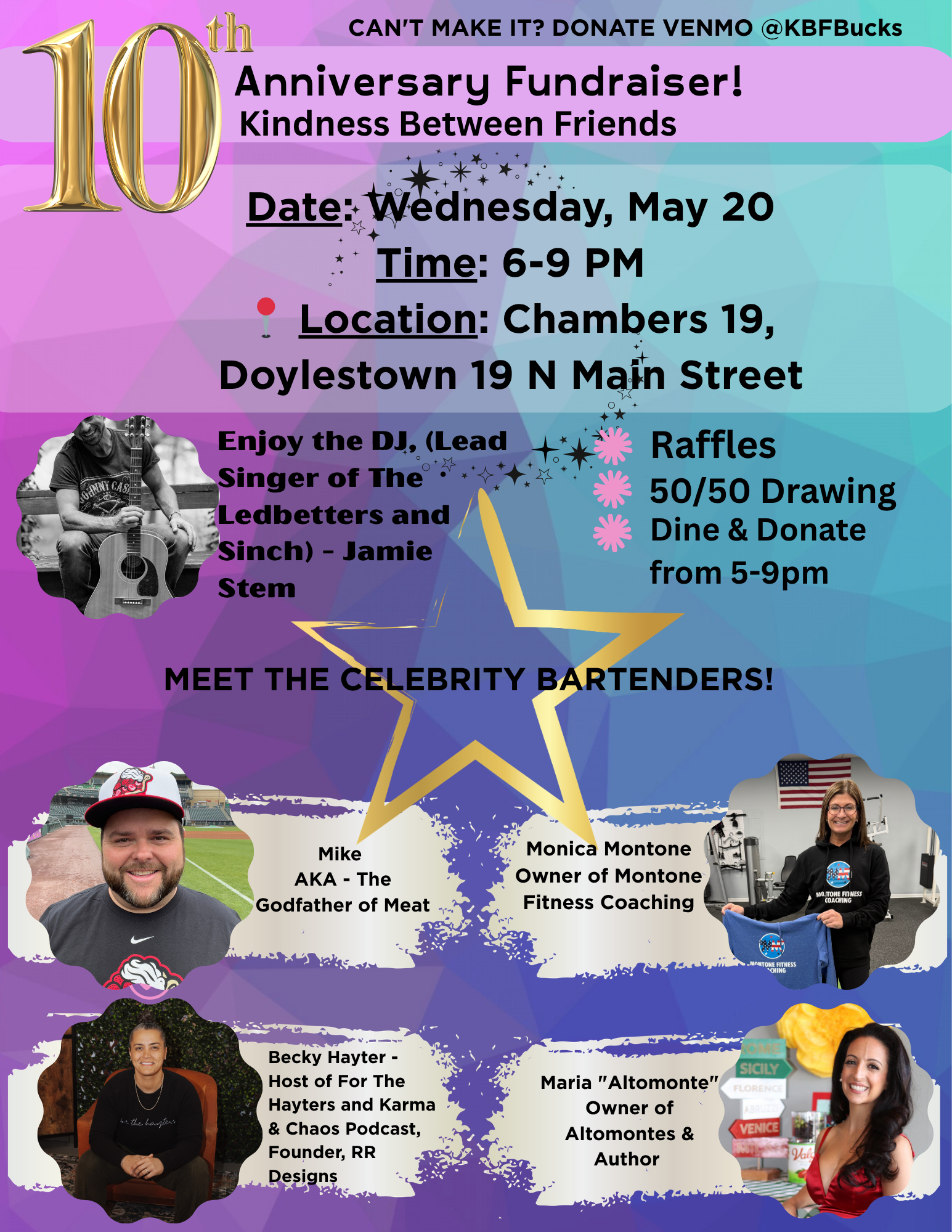 KBF is hosting an exclusive 10 yr Anniversary Celebrity Bartender Fundraiser at Chambers in Doylestown on Wednesday, May 20 from 6 PM to 9 PM! Dine & Donate will also be going on simultaneously from 5-9 PM.