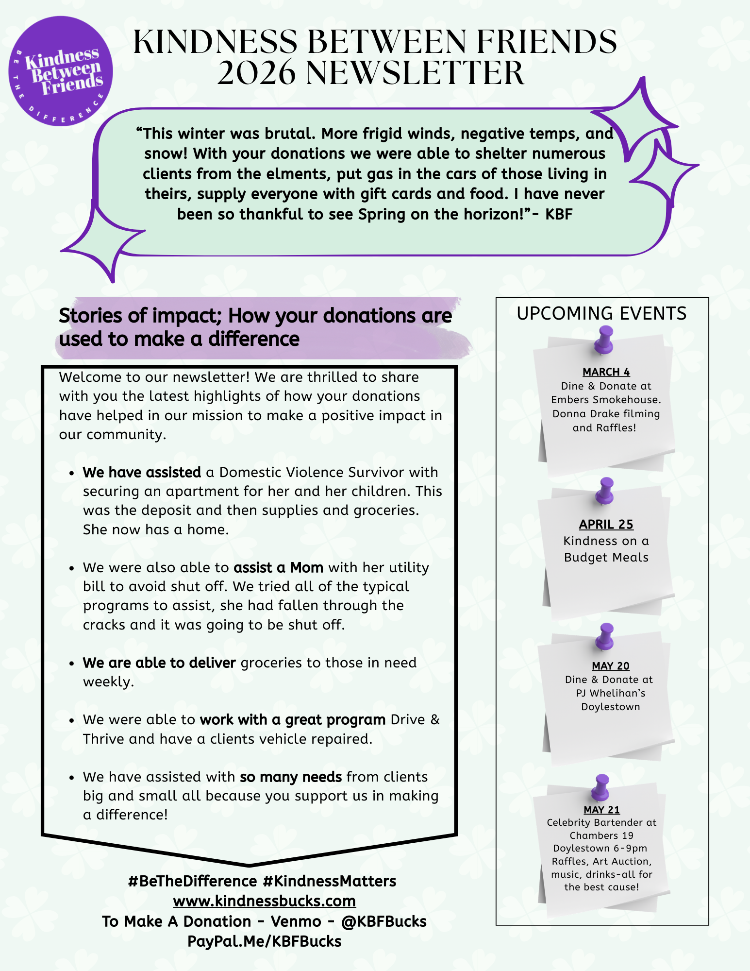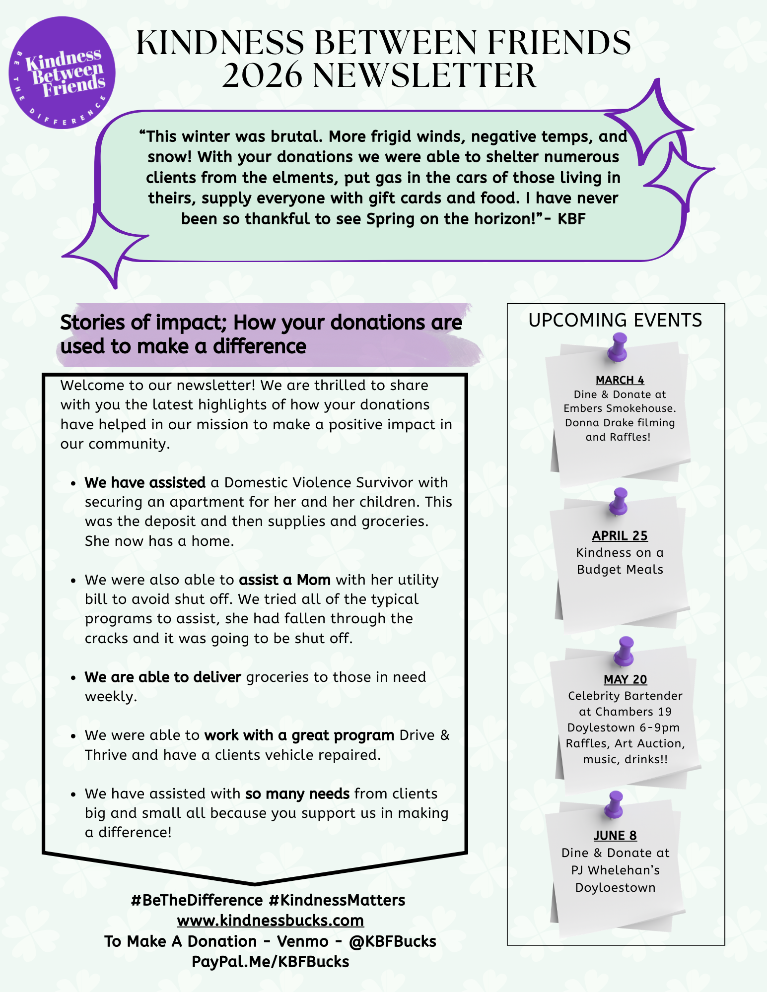 At Kindness Between Friends, Inc., we are dedicated to empowering individuals and families facing housing insecurity, food scarcity, domestic violence, and low-income challenges in Bucks and Montgomery County. Our mission is to provide compassionate, long-term support through personalized resources and life skills education, ensuring that every client has the opportunity to transition from crisis to stability. Every dollar donated is a step towards building a stronger, more resilient community. Over the last 10 years of working with individuals facing struggles and trauma, we have realized that everyone has a story—a past that shaped them, a present they are navigating, and a future they hope for. Through this experience, we have learned that the most powerful thing we can provide is not just physical and financial support, but genuine care, active listening, and dignity.